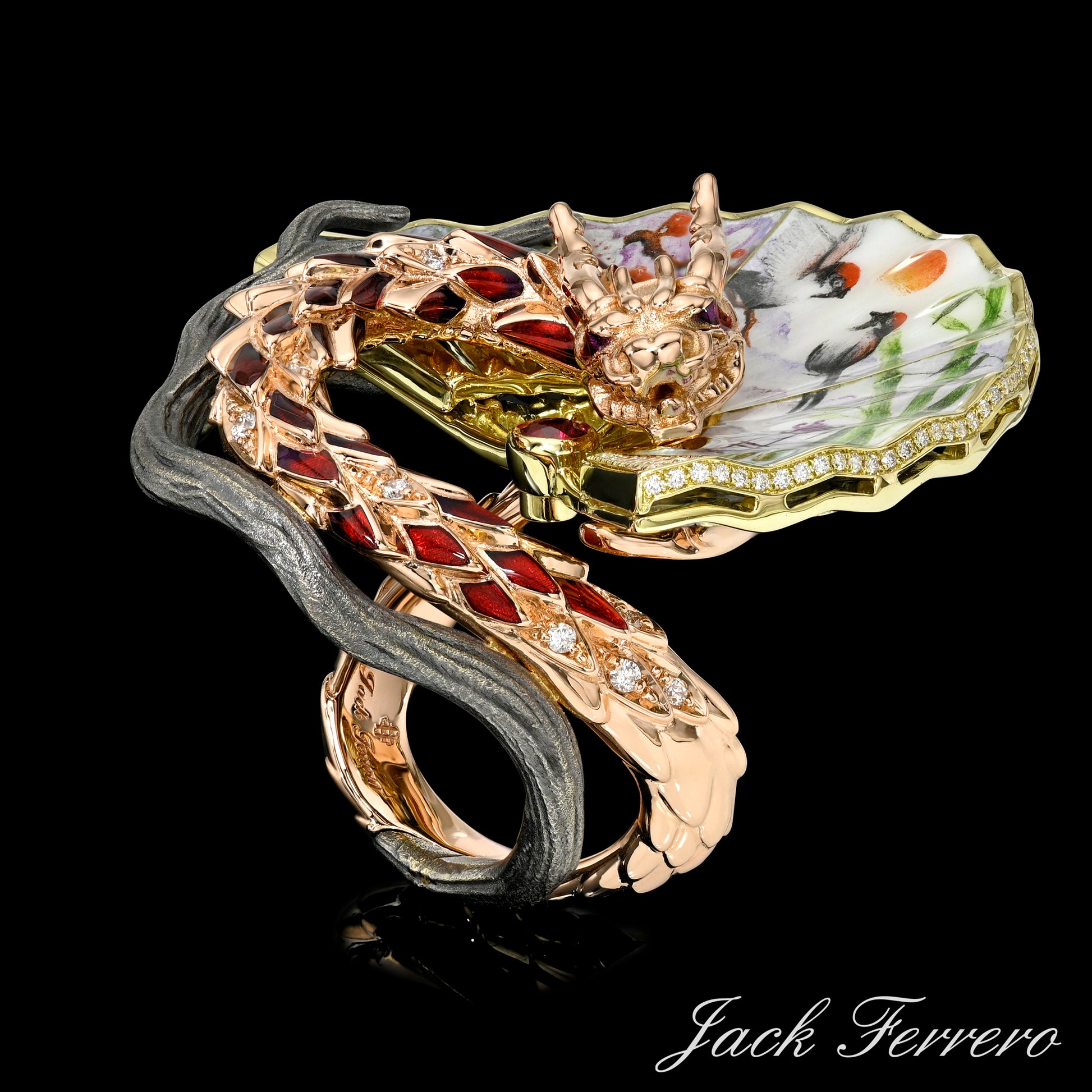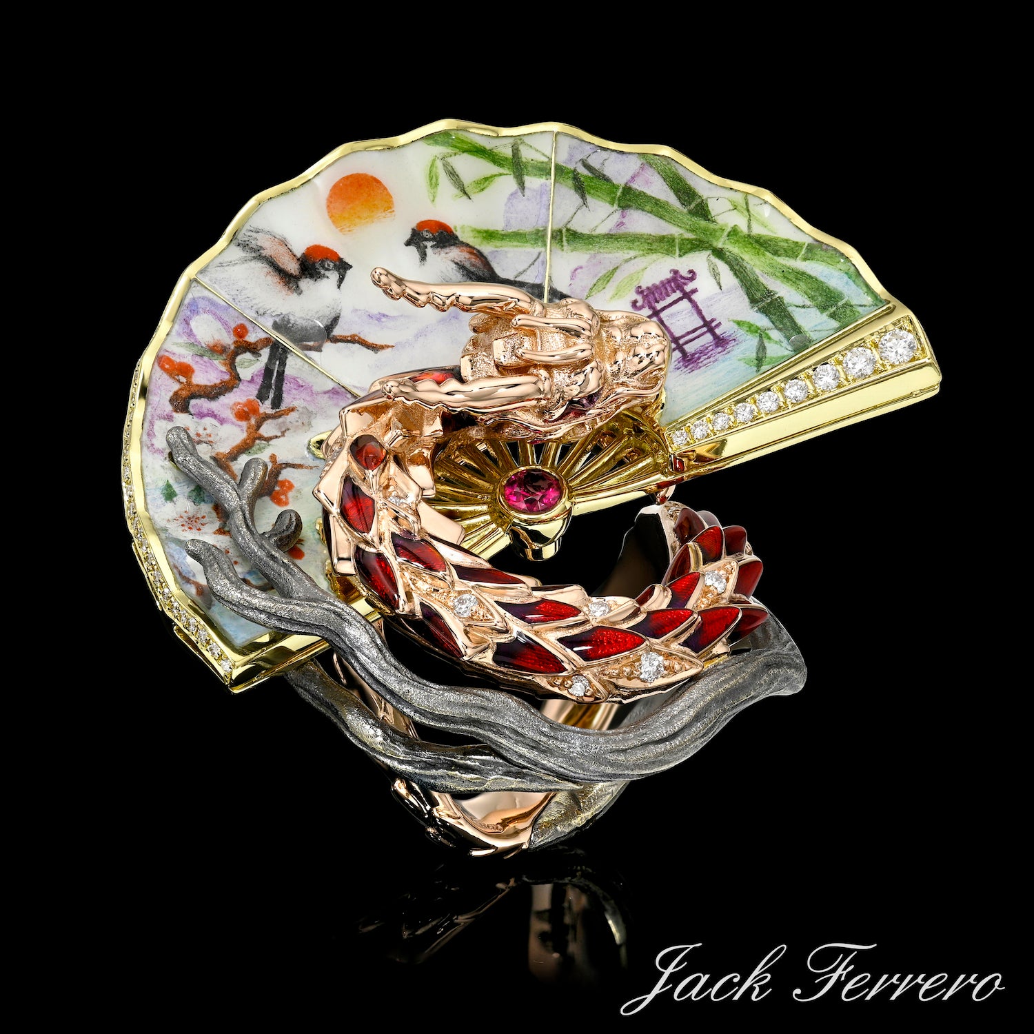 A striking fusion of myth and artistry, this ring is crafted in 18K Gold and crowned with a hand-painted fan of Hot Enamel depicting a tranquil Eastern scene. A sculpted dragon, with fiery red enamel scales, wraps around the design, accented with Brilliant-cut White Diamonds and a vivid Pink Sapphire at its heart. A masterpiece of storytelling and craftsmanship — where every detail whispers of ancient power and refined beauty.