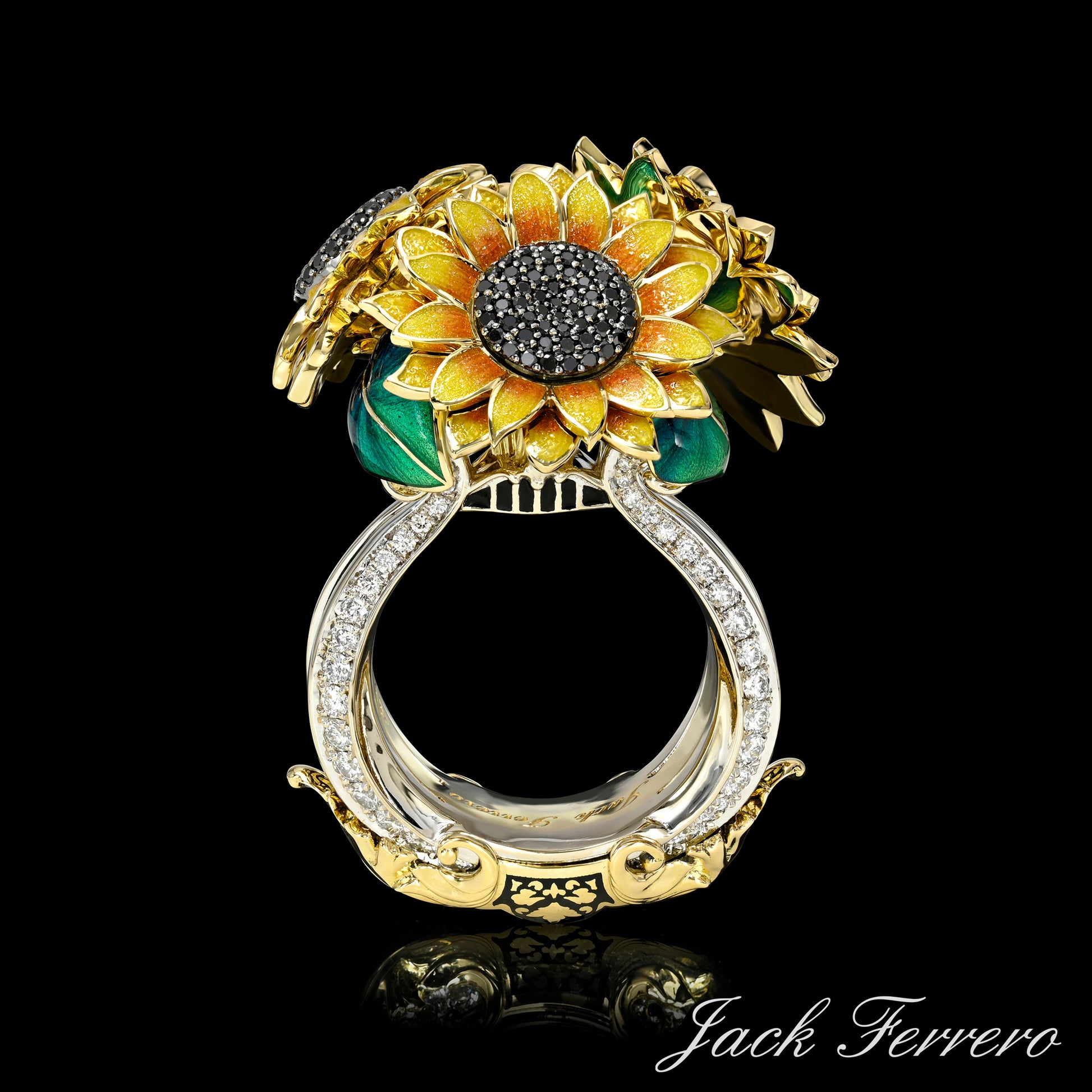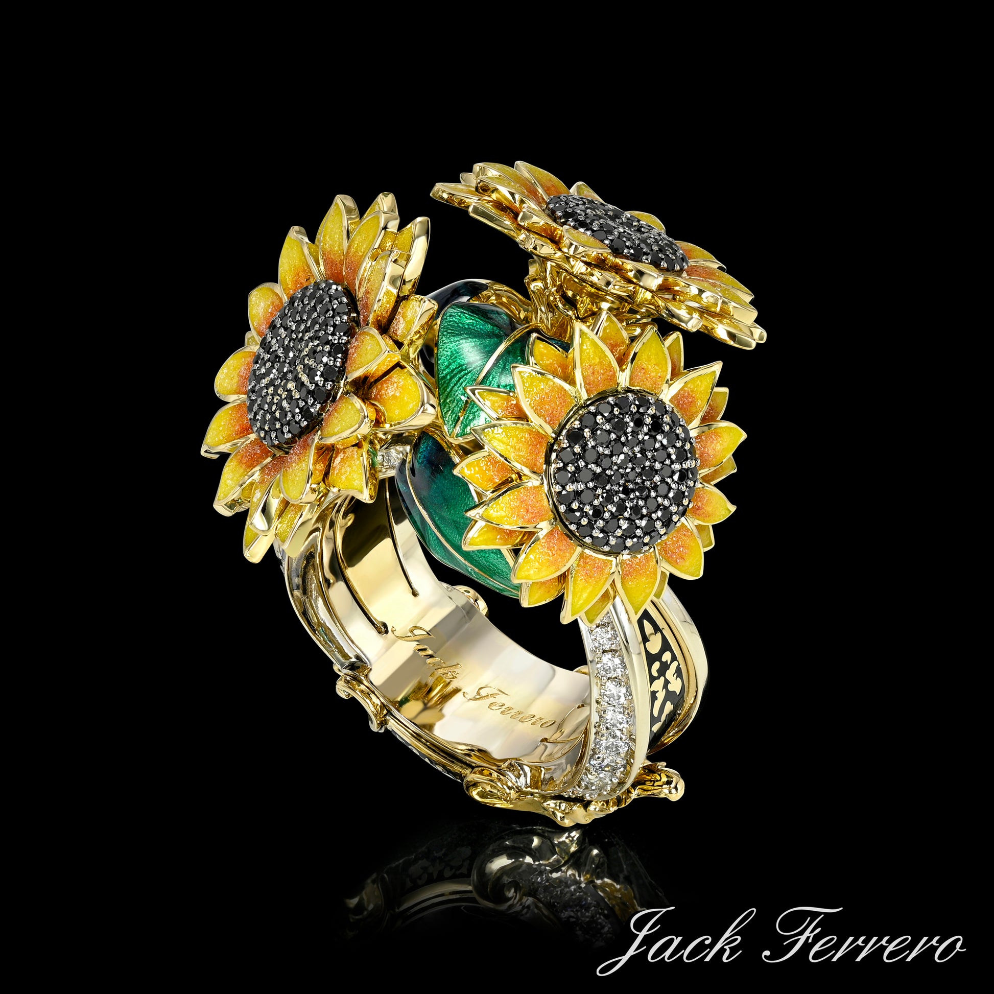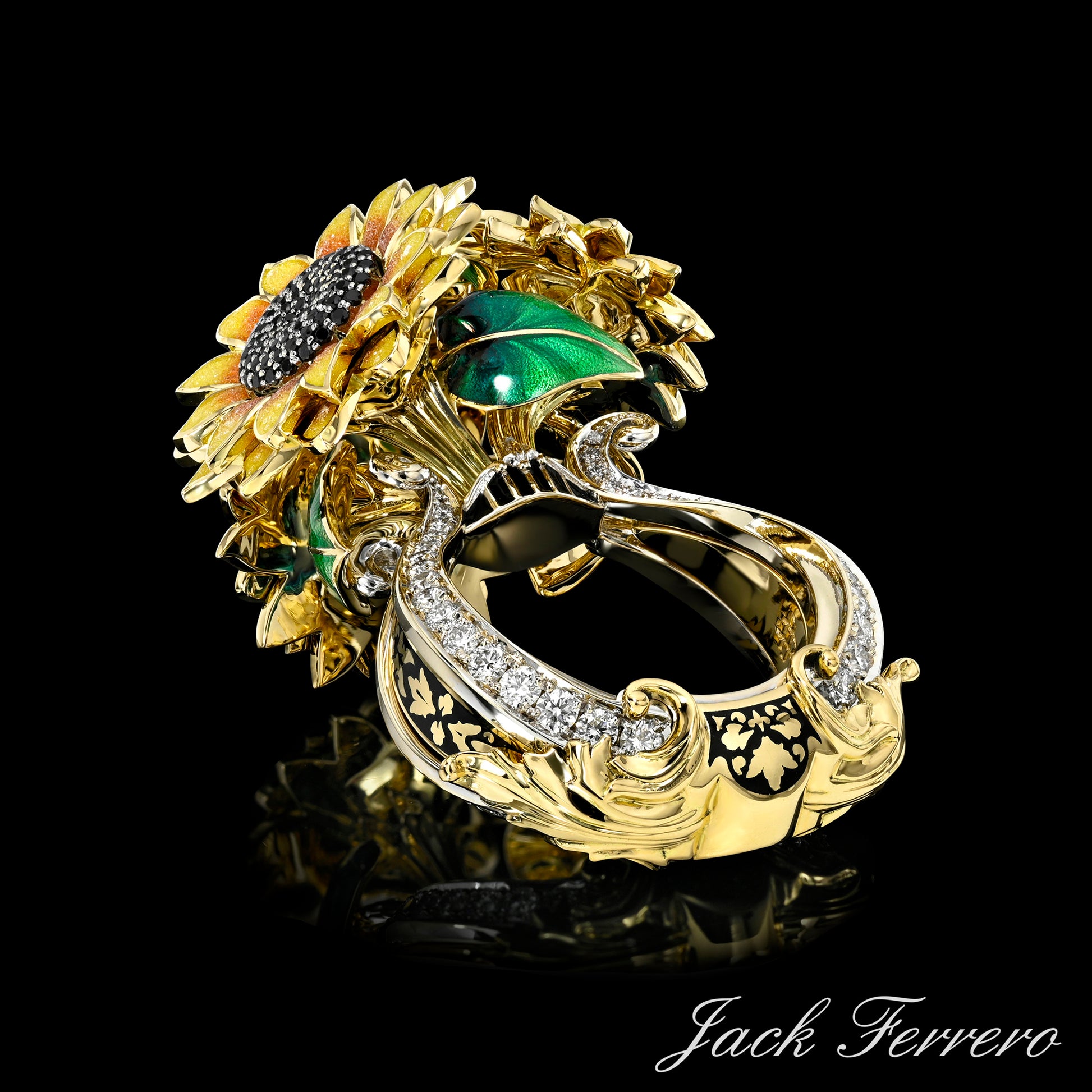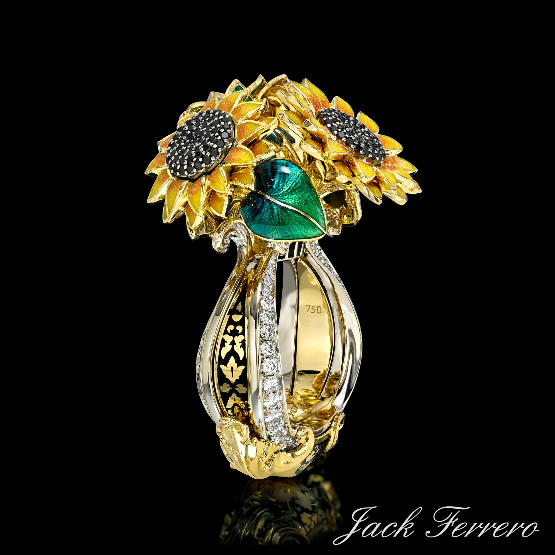 Inspired by the divine light of Apollo and the bold beauty of sunflowers, this radiant ring is a tribute to warmth, strength, and artistry. Crafted in 18K Gold, it features Hand-Enameled petals, vibrant green leaves, and a richly textured sunflower center set with Black Diamonds. The base with White Diamonds, sculpted like the strings of Apollo's harp, adds a poetic touch to this luminous creation — a celebration of sunlight, music, and eternal bloom.