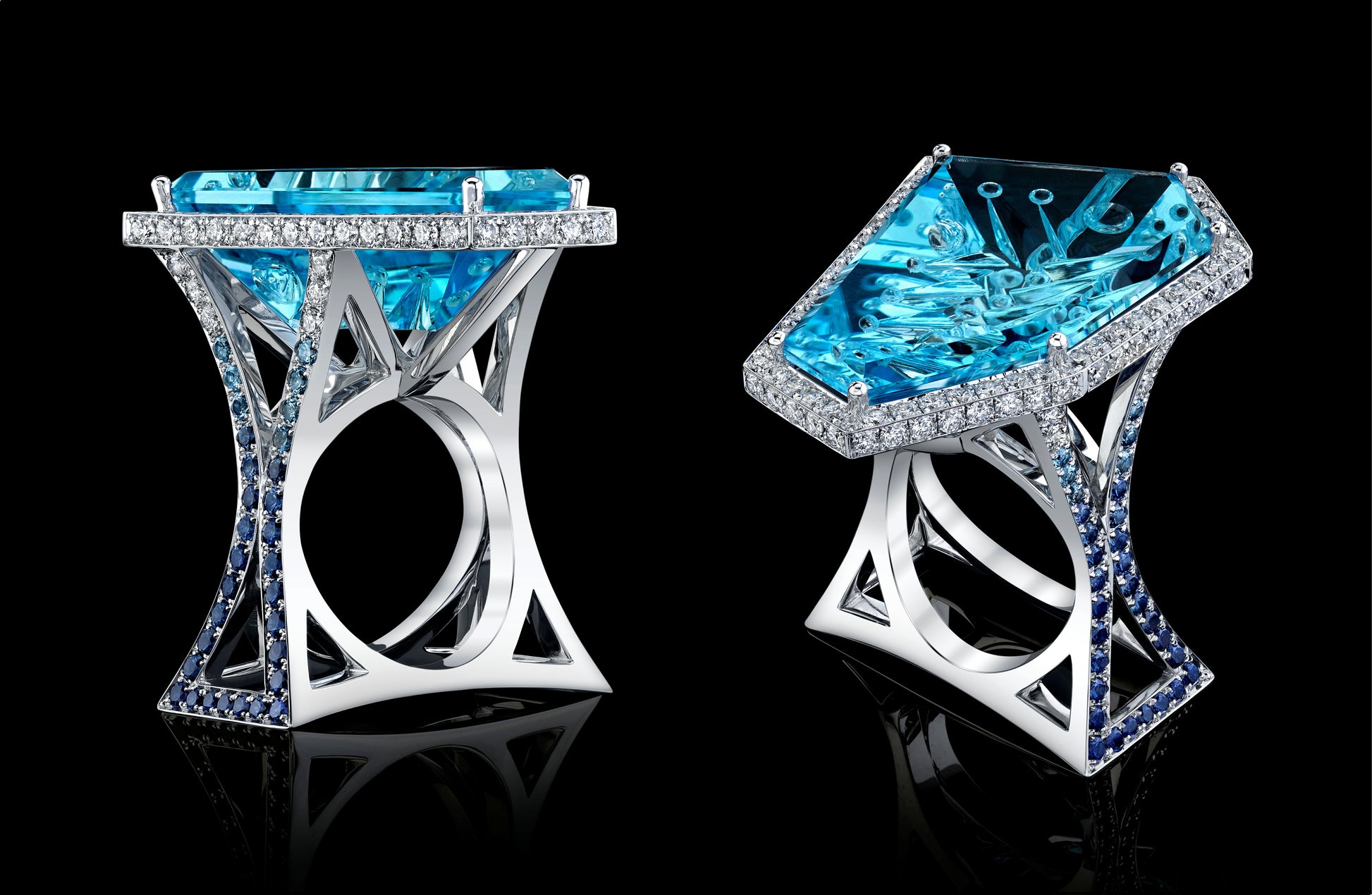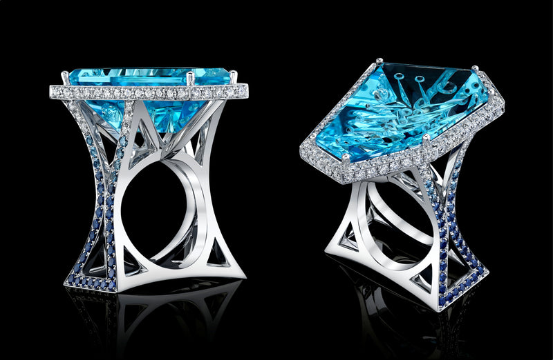 Stone: Finely engraved Aquamarine (center), Brilliant-cut White Diamonds, Gradient Blue Sapphires (dark to light)
